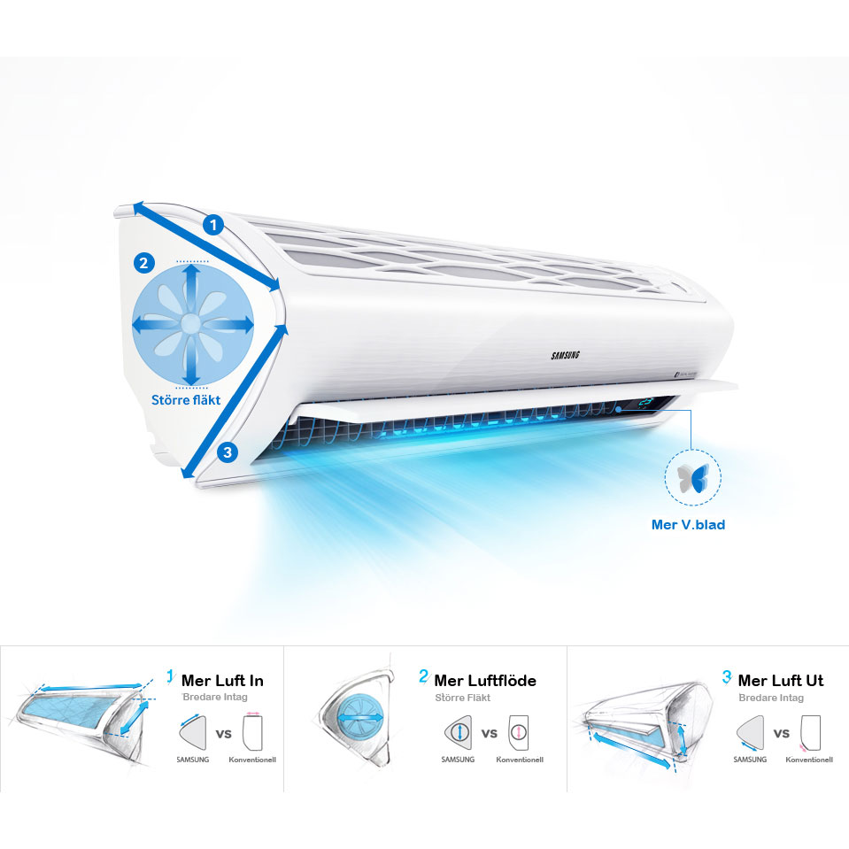Med Samsung Smart Comfort 9 har man frångått den traditionellt kvadratiska designen för en triangulär form. Den nya formen möjliggör ett bredare luftintag, större fläkthjul och bredare luftutblås. Resultatet blir ett ökat luftflöde som effektivare värme eller kyler ditt hus.