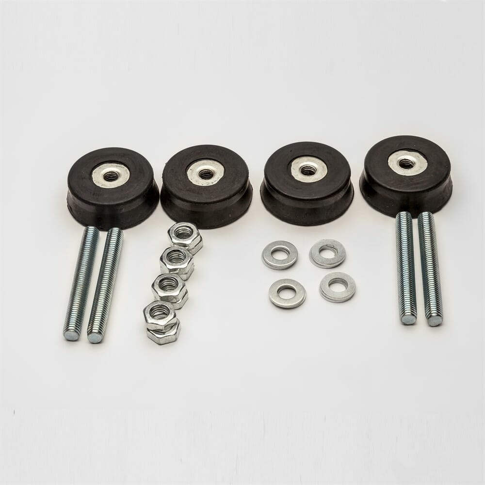 I en förpackning medföljes fyra stycken vibrationsdämpare (gummifötter), inkl. fyra bultar, åtta muttrar, och åtta brickor.